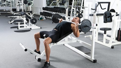 - Stelle die Lehne deiner Bank schräg nach oben und lege dich so mit dem Rücken darauf, dass du deine Arme gerade nach unten ausstrecken kannst. Halte dabei je eine Kurzhantel in jeder Hand.