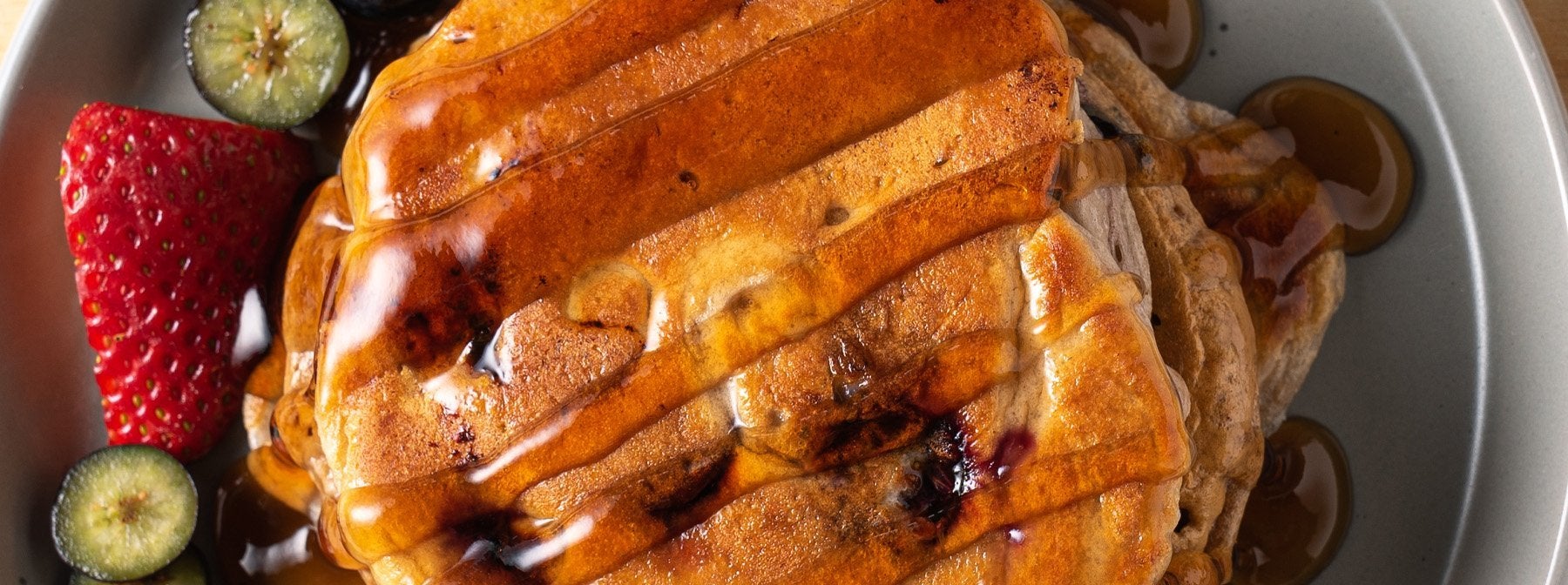 Bereite zunächst den Protein Pancake Mix zu, in dem du 2 große Messlöffel (50g) zu 100-150 ml Wasser oder Milch hinzugibst. Mixe das Ganze gut durch, bis es klumpenfrei ist.