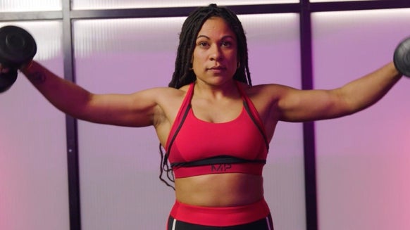 - Hebe die Kurzhanteln an, sodass sie in einer Linie mit deinen Schultern stehen und deine Handflächen zum Boden zeigen.